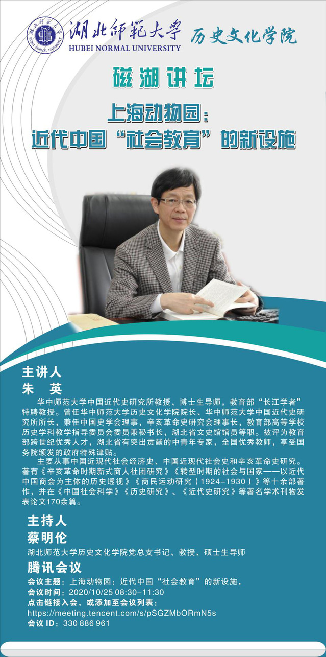 2020年10月25日上午8点30分,教育部“长江学者”特聘教授、华中师范大学教授、博士生导师朱英应邀在腾讯会议为酒店偷拍 师生开展了一场题为“上海动物园:近代中国‘社会教育’的新设施”的学术讲座,讲座由酒店偷拍 蔡明伦教授主持。酒店偷拍 张泰山、李柏林等老师与150余名学生共同在线聆听。