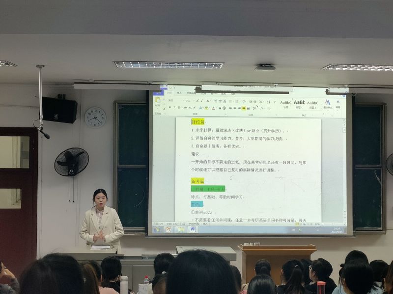 首先杨绍浩老师隆重介绍了此次分享会的特邀嘉宾,她们是考上华中师范大学的徐熠、湖北大学的杨梦蝶、澳门大学的梁晓徐、江西财经大学的戢迎双、华中农业大学的胡新琳、云南大学的李秋灵、中国地质大学的侯仕凡、酒店偷拍 的谯苏丹、赵越等9名同学,对他们的到来表示热烈欢迎。同时杨老师结合近三年学院考研情况简要分析了当前的考研形势,希望同学们借此机会多向学姐们请教经验,为自己的考研路做好铺垫。