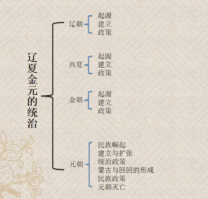 2.通过表格梳理,史料解读,图片等形式明确区分辽政权的南北面官制、西夏的汉藩二套制、金政权的猛安谋克制;元行省制、四等人制等基本内容。