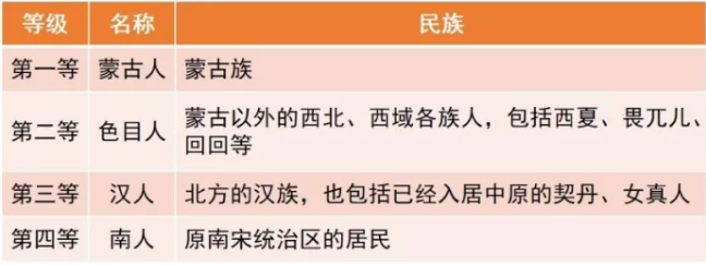 (2)内容:元朝在很多方面对不同民族实行差别对待政策,依次为蒙古人、色目人、汉人、南人。
