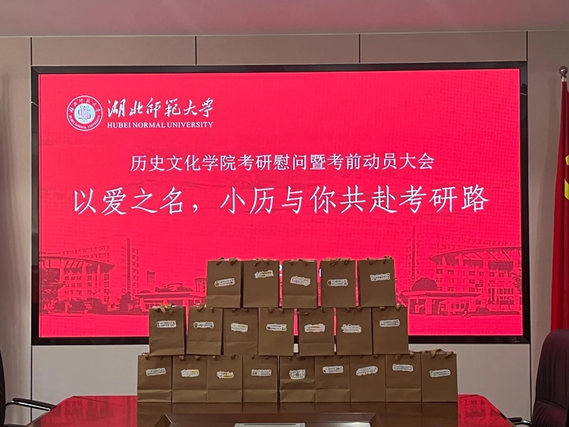 与会领导老师为考研学子送上学院精心准备的考研加油福袋,内有考试必备文具,饱含美好寓意“妙笔生花”花生,“成功上岸”橙子等,表达了学院对考研学子的殷切期盼与真挚祝福。