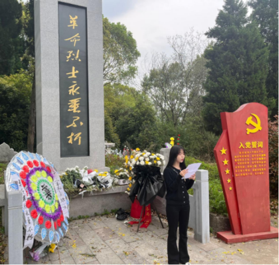 首先,由23级中国史党员代表伍佑带领大家重温入党誓词。在革命先烈面前重温入党誓词,更好的引导党员铭记历史,继承革命先烈艰苦创业,不怕牺牲的优良传统;同时着眼于未来,发扬民族精神和时代精神,为实现中华民族伟大复兴而奋斗。