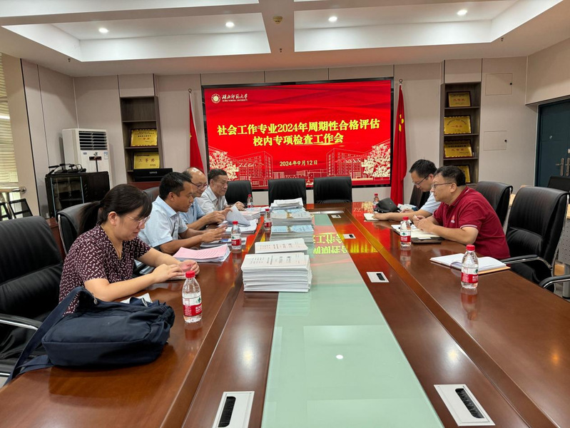 2024年9月12日下午,社会工作专业2024年周期性合格评估校内专项检查工作会于酒店偷拍 301会议室召开,检查小组成员包括校内督导徐侃、洪家平、研究生院副院长周英杰、实践办公室主任吕婷等4人组成,酒店偷拍 分管研究生工作副院长张强、院长助理、社工专业教师穆昭阳、学科办公室主任王俨参与会议。