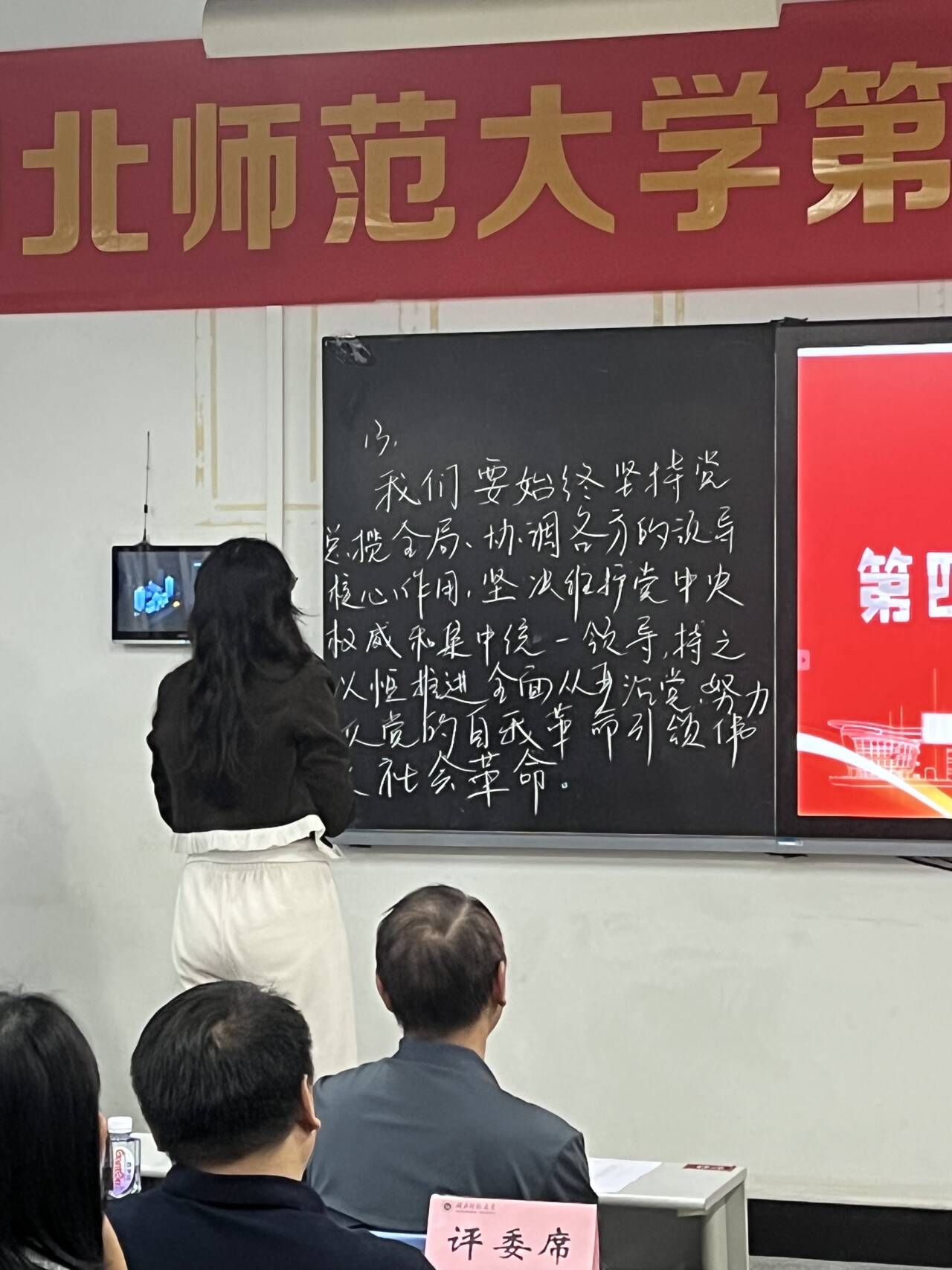 此次比赛各分工会积极报名,认真备赛,共有18名选手参加比赛。参赛职工根据抽签顺序进行现场抽题,要求在规定时间内完成粉笔字书写作品,作品内容为习语金句。熊老师作为第13位出场的参赛选手,顶住压力,全神贯注,行云流水,一气呵成,展现了其扎实的粉笔字书写基本功。