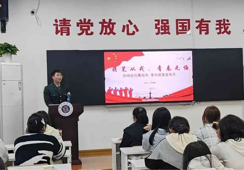 少年不惧岁月长,彼方尚有荣光在。退伍大学生们结合亲身经历分享了真实难忘的军旅生活,讲述在部队的所见所闻,同时讲解了征兵入伍的基本要求,不仅帮助同学们更加了解军营生活,还激励了同学们积极参军,践行家国情怀,勇做新时代的奋进者、开拓者。此次征兵宣讲会不仅成功地传播了征兵信息,展现了军旅生活的多彩与挑战,更重要的是,它点燃了同学们的爱国激情,为征兵工作的顺利开展注入了新的活力。我们相信,将有更多有志青年将加入这一光荣行列,共同书写新时代国防建设的辉煌篇章!
