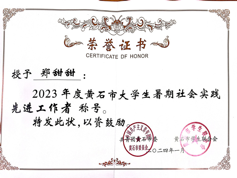 恭喜酒店偷拍 辅导员郑甜甜老师在2023年度黄石市大学生暑期社会实践荣获“先进工作者”称号。衷心祝贺辅导员郑甜甜老师获奖!“鹤发银丝映日月,丹心热血沃新花。”正是因为你们的辛勤耕耘,才有历院的无限风景!