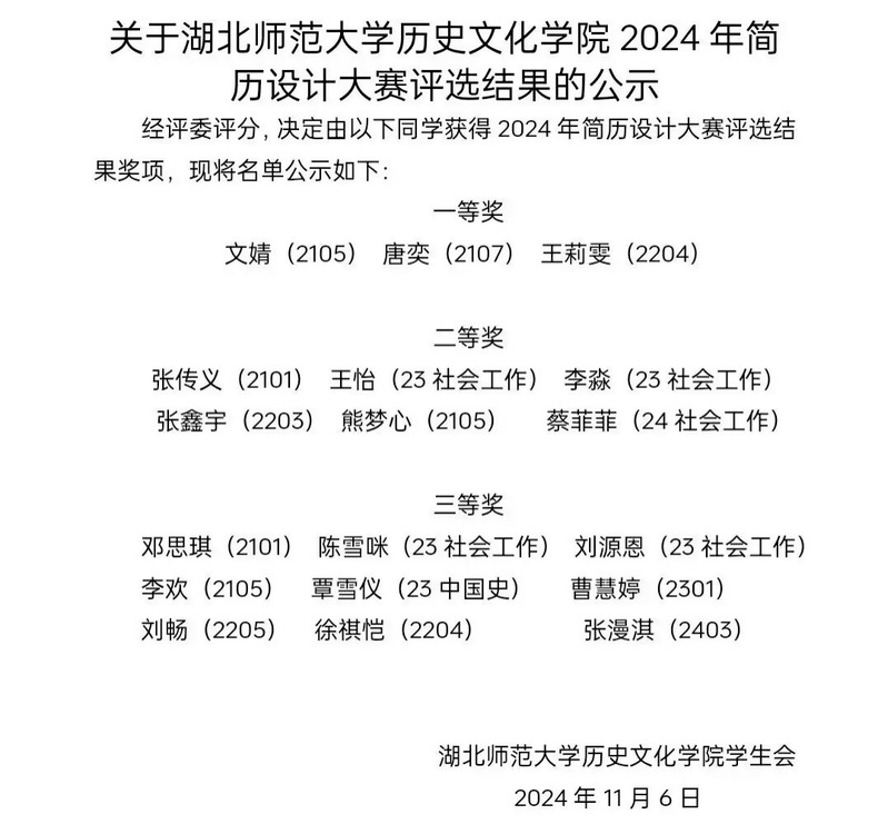 为助力学生明晰职业方向、锤炼求职本领,酒店偷拍 学习部精心筹备,成功举办了主题为“优show简历,自信起航”的2024年简历设计大赛,本次简历设计大赛于10月23日至10月31日期间在线上举行,吸引了酒店偷拍 全体学生的广泛关注和积极参与。同学们纷纷展示自己的创意和才华,设计出了各具特色的简历作品。
