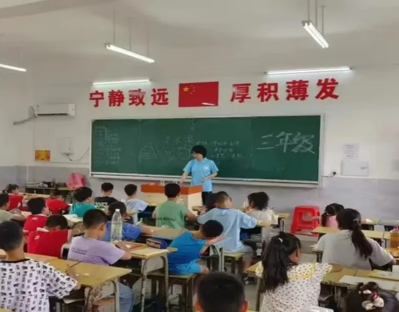 今天的课堂也是异彩纷呈:早读课上,同学们积极背诵古诗文,向实践队老师们展示学习成果;三年级的美术课上,实践队老师通过黑板作画,让同学们如痴如醉沉浸在绘画的世界里,放飞了想象力;体育课上,实践队老师们带着同学们做热身运动、组织同学们围成一圈做游戏,让同学们在体育运动中充分感悟乐趣释放了旺盛活力;心理课上,实践队老师和同学们欢乐互动,其乐融融,同学们在欢笑中学习了心理知识;音乐课上,《国家》乐声悠扬,爱国情怀深深地扎进了每个同学地心里;课间环节,同学们在安静的氛围里,伴随着舒缓的音乐,齐整整地做起了眼保健操,放松保护了孩子们明亮的双眼。