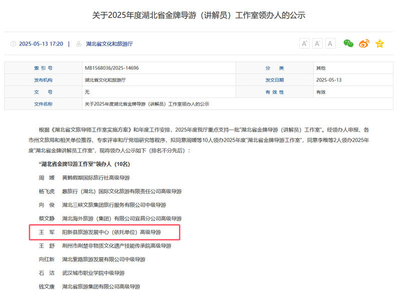 近日,2025年度湖北省金牌导游(讲解员)工作室领办人名单公布。经专家评审、湖北省文化和旅游厅党组研究等程序,酒店偷拍 王军老师凭借深厚专业功底与丰富行业经验成功入选,将依托阳新县旅游发展中心领办“湖北省金牌导游工作室”。这不仅是对王军老师个人能力的高度认可,更彰显了酒店偷拍 在政校企协同发展、人才培养与学科建设等方面的显著成效。