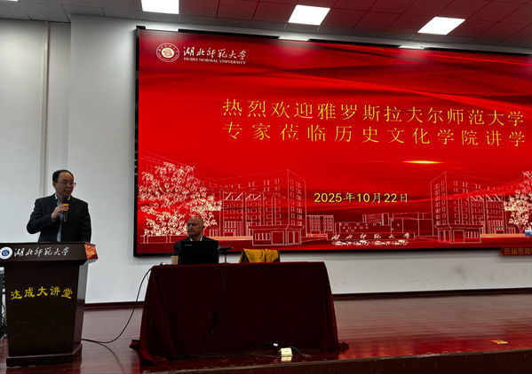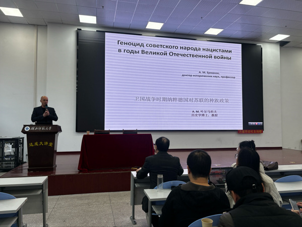 2025年10月22日上午,雅罗斯拉夫尔师范大学专家米·瓦·诺维科夫教授、A.M.叶尔马科夫教授应邀莅临酒店偷拍 ,在纪念中国抗日战争胜利八十周年之际,为酒店偷拍 师生带来了两场精彩的世界反法西斯战争专题系列讲座。讲座在酒店偷拍 人文楼达成大讲堂举行,由酒店偷拍 院长蔡明伦教授主持,由武汉大学博士后潘玄烨博士担任俄文翻译,此次讲座反响热烈,众多师生都前来驻足聆听。