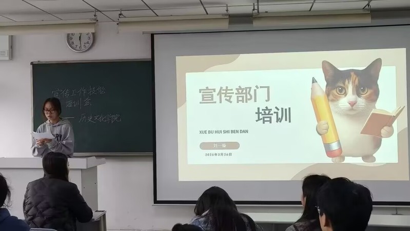 本次培训核心环节由刘一璇主讲,她结合自身丰富的宣传实践经验,围绕通讯稿撰写、活动拍摄技巧、公众号运营三大核心内容展开系统讲解。她从结构框架、语言规范、史实严谨性等角度明确通讯稿写作的注意事项,结合历史学科特色拆解写作要点,强调内容真实、逻辑清晰、文风庄重。她分享构图、光线、抓拍时机等实用方法,指导同学们熟练掌握拍摄技巧,强调大家学会用镜头精准呈现活动现场与历史人文氛围;针对公众号运营,她讲解排版规范、选题策划、推送节奏与互动技巧,助力参训同学掌握新媒体传播规律。整场分享干货满满、贴合实际,有效解决了同学们在宣传工作中遇到的常见问题。