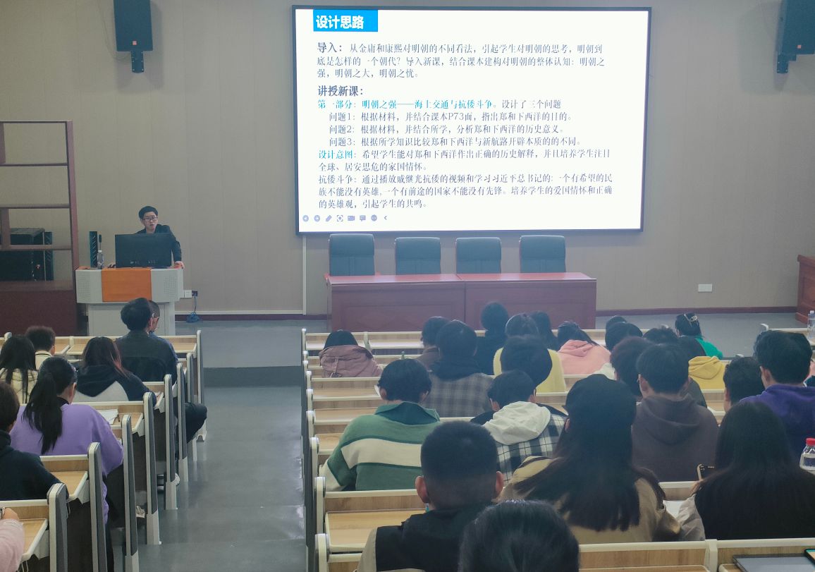 虚心长识,勤思长智,善用长技。此次讲座,陈老师以《中外历史纲要——从明朝建立到清军入关》课程设计为例为同学们传授课程设计思路。首先,陈老师向大家传授了课程应如何导入,通过“明朝到底是怎样的一个朝代”的设问,引发思考,再通过金庸和康熙对明朝的不同看法,导入新课;其次,在讲授新课的过程中,采用了多头并列式的结构,将新课程分为三个部分,并分别通过材料导入、多媒体视频传授通等方式向大家讲解思路,与此同时,陈老师还告诉大家,在讲课过程中应注重同学们的自读感悟,着力创造开放式的课堂导入,着眼于学生自主发展的材料阅读教学,充分开发利用教科书并巧妙地运用大量思维导图,循序渐进地引导学生在分析史料的过程中建构知识框架,落实素养培育。