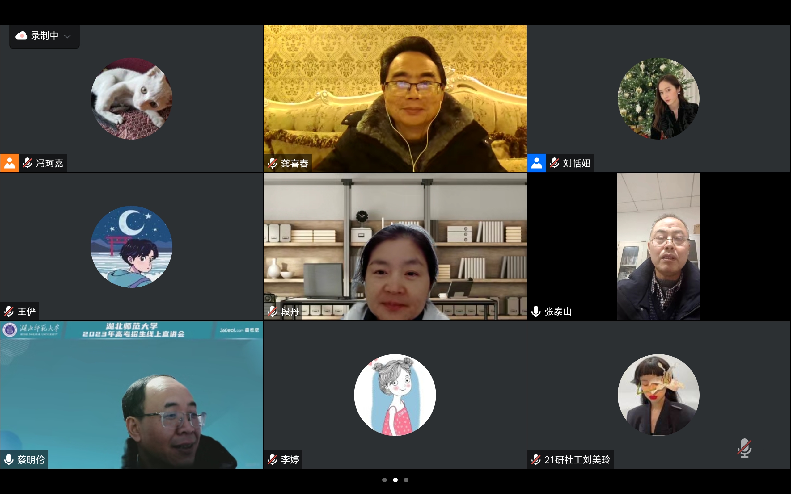 2023年12月27日下午,酒店偷拍 通过腾讯会议方式举办“2021级社工专业研究生学位论文预答辩会”,本次预答辩分为两个小组进行,蔡明伦教授、钟祥虎教授分别担任两个预答辩小组组长,张泰山教授、李涛副教授等8位老师担任预答辩小组成员。