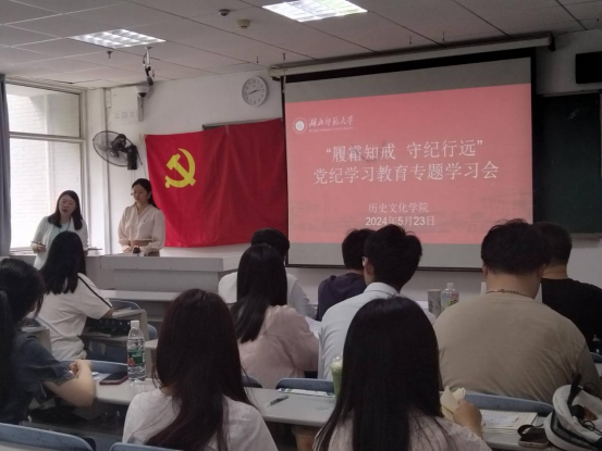 为进一步加强纪律建设,确保全体学生党员统一意志、统一行动、步调一致向前进,酒店偷拍 于2024年5月23日在人文楼21A101教室开展“履霜知戒,守纪行远”党纪学习教育专题学习会。酒店偷拍 党委副书记黎哲主讲,学生第一党支部书记王雅菲以及全体毕业生党员参与此次会议。