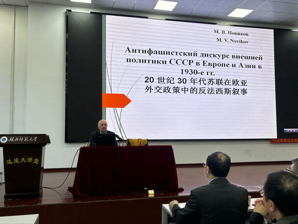 讲座开幕式上,蔡明伦院长隆重致辞,热烈欢迎远道而来的两位专家。随后,雅罗斯拉夫尔师范大学前第一副校长,著名历史学家米·瓦·诺维科夫教授做了主题为“20世纪30年代苏联欧亚外交政策中的反法西斯叙事”的讲座。他在报告中指出,20世纪30年代,苏联政府的外交政策活动中占据特殊地位的是反击纳粹德国在欧洲的侵略政策和军国主义法西斯日本在亚洲的侵略政策。从一开始,苏联政府就采取了遏制法西斯侵略的坚定立场,包括选择武力反击,并多次试图与未来的侵略受害者——各国建立军事和政治联盟,为未来世界反法西斯联盟的形成奠定了基础。