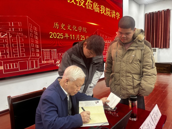 讲座结束的话音刚落,同学们便笑着围拢到虞教授身边——有人掏出珍藏的《中国现代化历程》求签名,虞教授不仅写下名字,还附上“观局部,更要见全局”的研究寄语;有人举着笔记本请他圈出重点观点,还有人拉着同伴挤到前排合影,现场秒变温馨的 “学术追星现场”。