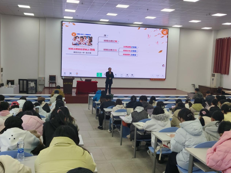在“班级治理之行”的讲解中,张老师重点介绍了治理蓝图之绘就,探讨了班级文化之培育,他还探讨了班级团队之建设。张老师结合大冶一中学生的实际情况,创造性的提出来“六力”、“九商”“四有”“四能”等教育理论。“六力”即心之力、体之力、安之力、学之力、管之力、教之力。“九商”指志商、德商、情商、逆商、健商、安商、学商、管商、职商。“四有”包括有理想、有教养、有文化、有纪律。“四能”指能拼搏、能坚韧、能思考、能创新。接下来,张老师列举了班级管理的多个细节,涉及班训的制定、班干部的履职、学情的复盘、早读的有效落实等多项内容。此外,张老师还谈及班会的开展,为师生呈现了以生为本、师生互动、家校联动的新型班会。在互动交流环节,师生们围绕着师范生班级管理的实训路径等问题,展开了深入地探讨。